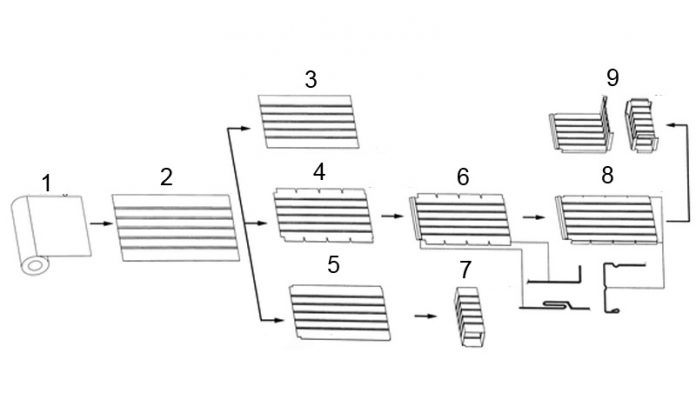 Dây chuyền sản xuất ống gió tự động AutoLine được cấu thành từ các phần gồm khung cấp phôi, máy cán gân, máy chạy bích, máy cắt tấm và máy gia công góc.